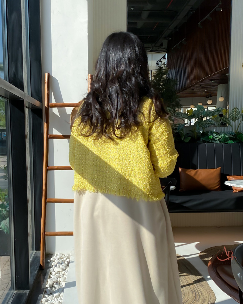 - تمتاز عباية شامواه بجاكيت تويد بتصميمها العصري والأنيق الذي يجمع بين الأناقة الكلاسيكية للجاكيت وجمال الخامة الشامواه للعباءة.